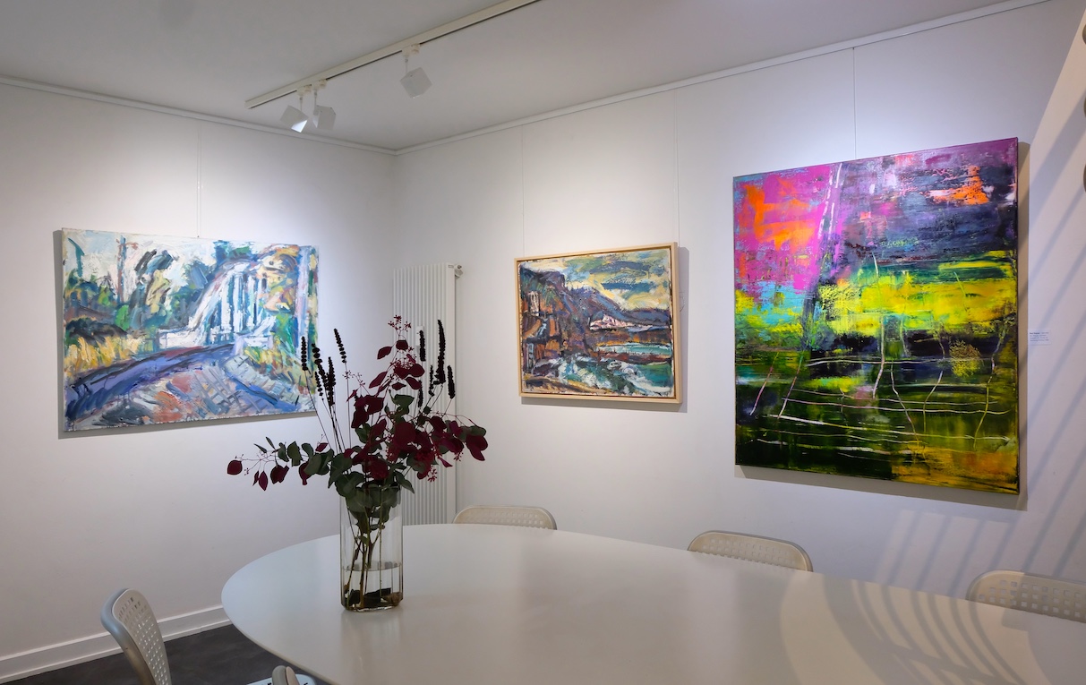 Eine spannende Reise durch Landschaften, gemalt auf Leinwand und Papier, aus unterschiedlichen Kulturen und Zeitabschnitten, expressiv bis abstrakt: Werke von Rudolf Gerhard Bunk aus 1952-73, von Maurice Haddad aus 1997-2003 und von Elvira Heimann aus 2023.