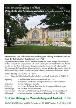 Stiftung StadtLandKunst ist Gastgeberin der Informations- und Diskussionsveranstaltung im Haus der Patriotischen Gesellschaft von 1765. Die Transformation der Mobilität ist eine große Herausforderung und zugleich eine große Chance für mehr Lebensqualität.